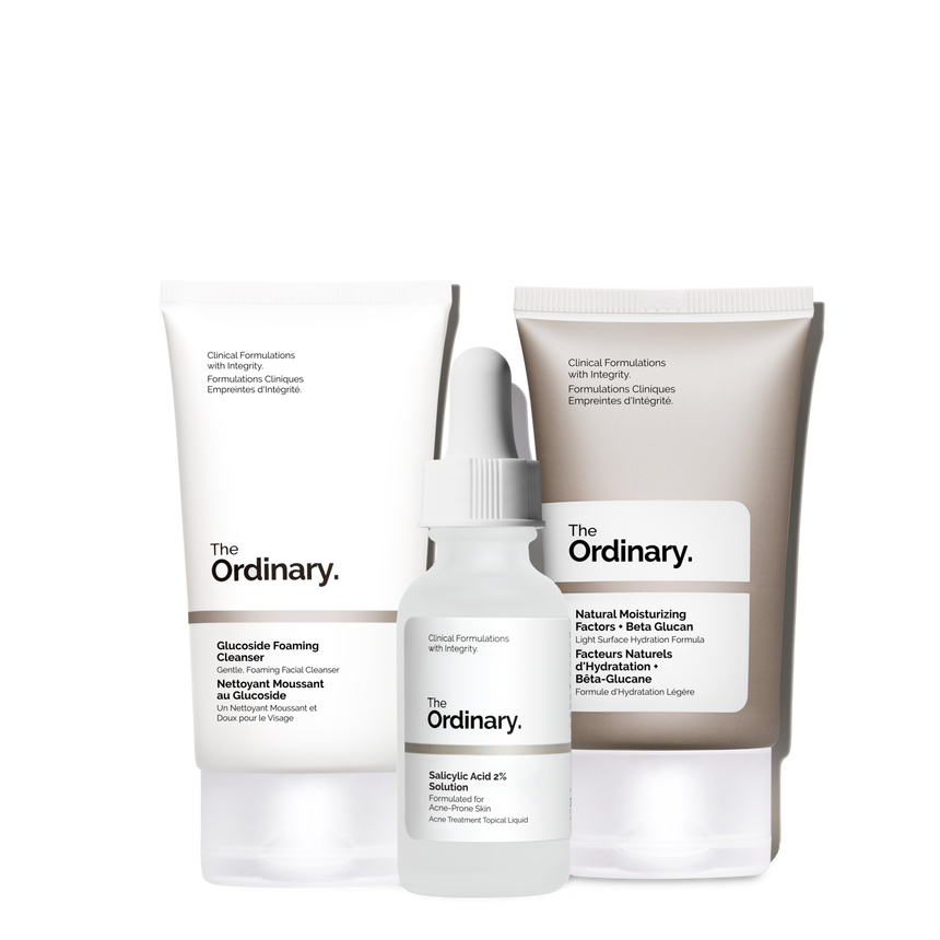 The Acne Set offers a targeted regimen, with Salicylic Acid 2% Solution for treating acne.