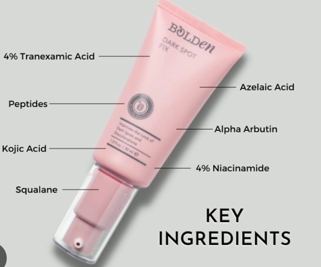 Bolden Dark Spot Fix is a concentrated serum using state-of-the-art ingredients to visibly improve the appearance of hyperpigmentation and dark spots. This advanced formulation features a blend that includes tranexamic acid, alpha arbutin, niacinamide, azelaic acid, and vitamin c to even out skin tone while preventing new discoloration from occurring. Expect visible results at two weeks, with increasingly dramatic clarity and benefits continuing up to 12 weeks and beyond.